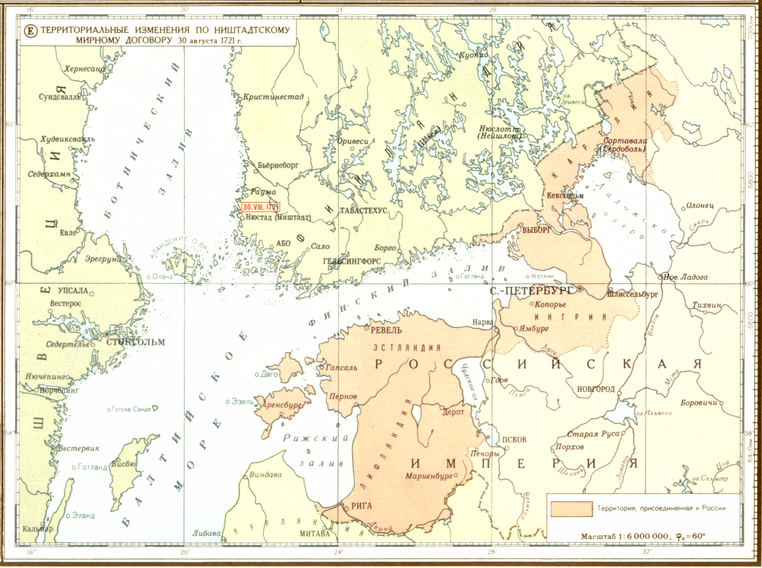 Северная война 1700-1721 гг. Перенесение войны на территорию швеции 1719-1721 гг. (Е) Территориальные изменения по Ништадскому мирному договору 30 августа 1721 г.