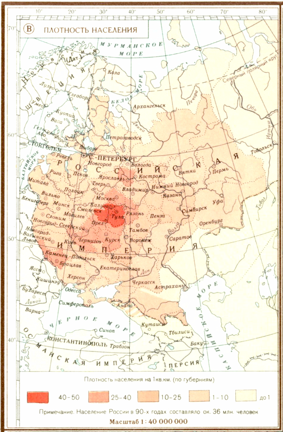 Военно-экономическая карта России к концу XVIII в. (В) Плотность населения.