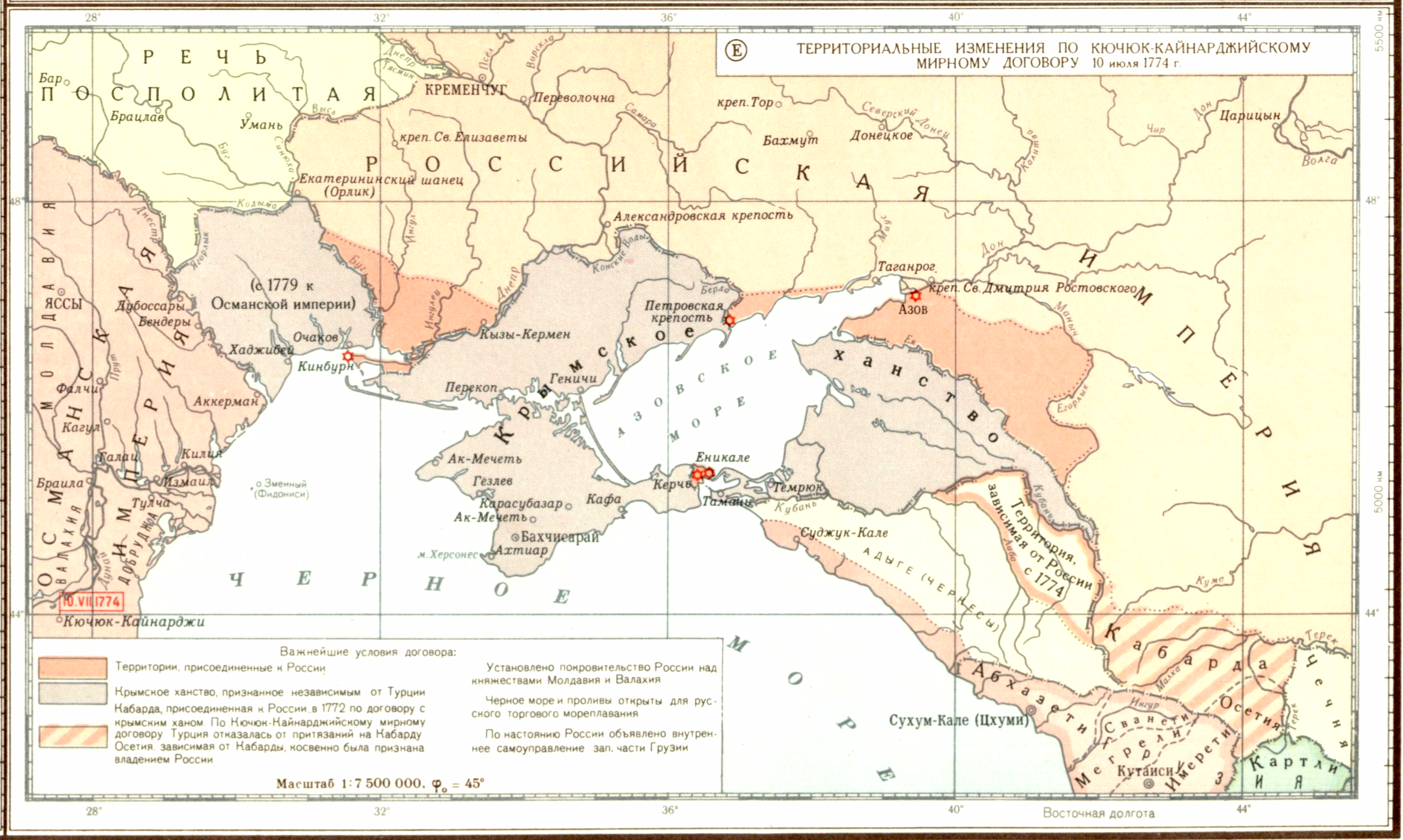 Русско-турецкая война 1768-1774 гг. (Е) Территориальные изменения по Кючюк-Кайнарджийскому мирному договору 10 июля 1774 г.