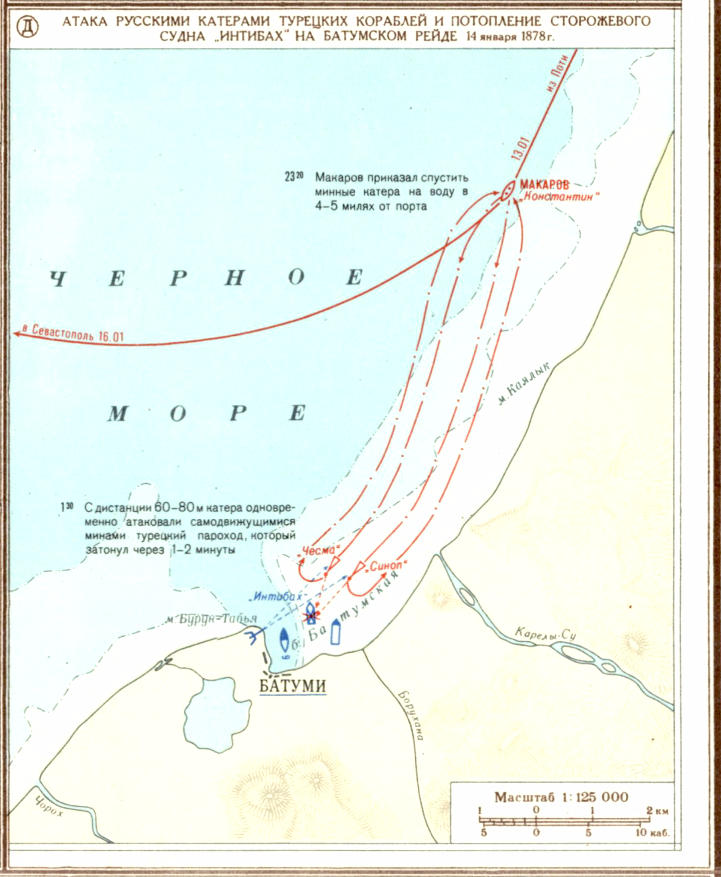 Русско-турецкая война 1877-1878 гг. (Д) Атака русскими катерами турецких кораблей и потопление сторожевого судна "Интибах" на Батумском рейде 14 января 1878 г.
