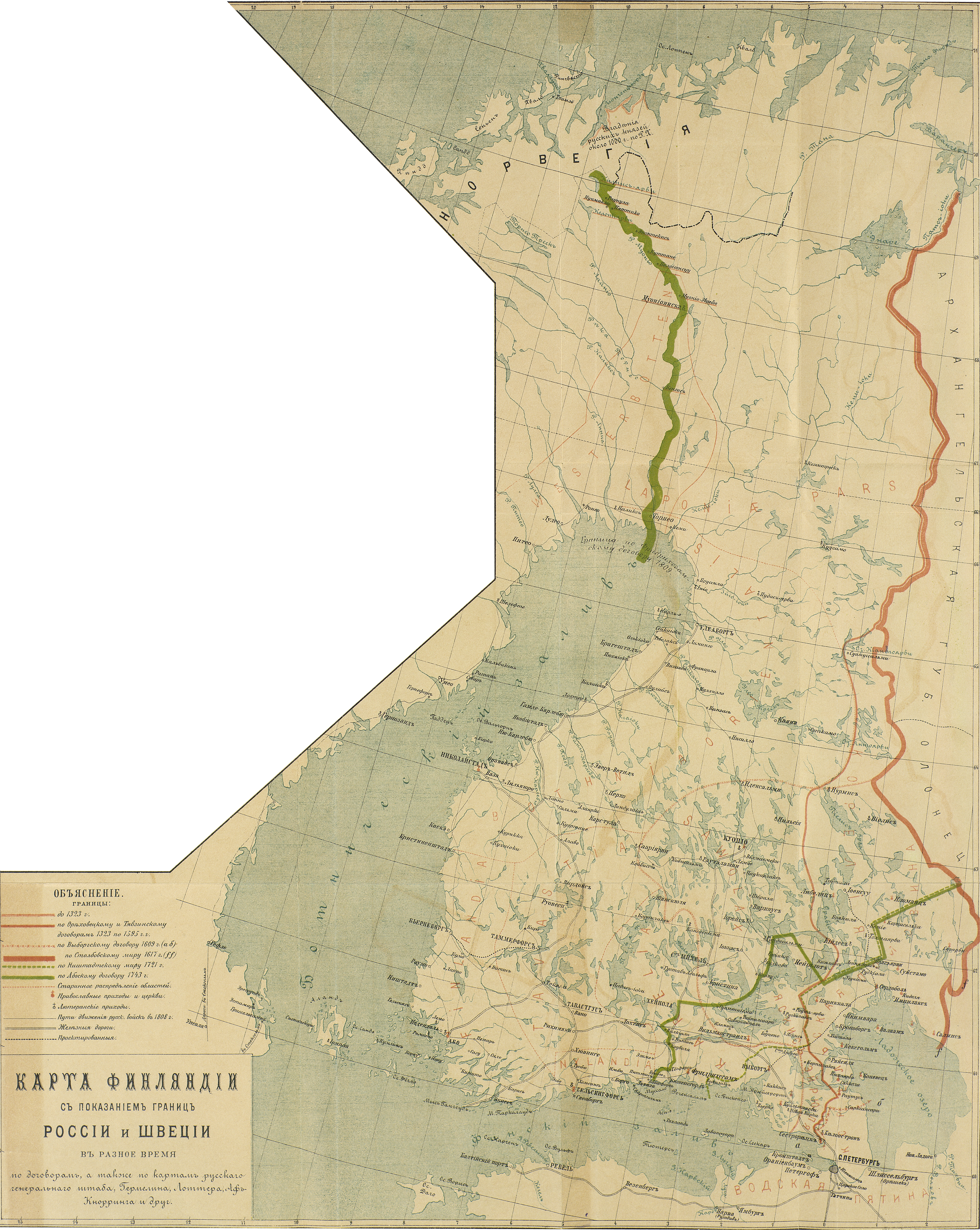 Финляндия с указанием границ России и Швеции в разное время, а также по картам генерального штаба, Гермелина, Лоттера, Аф-Кнорринга и других