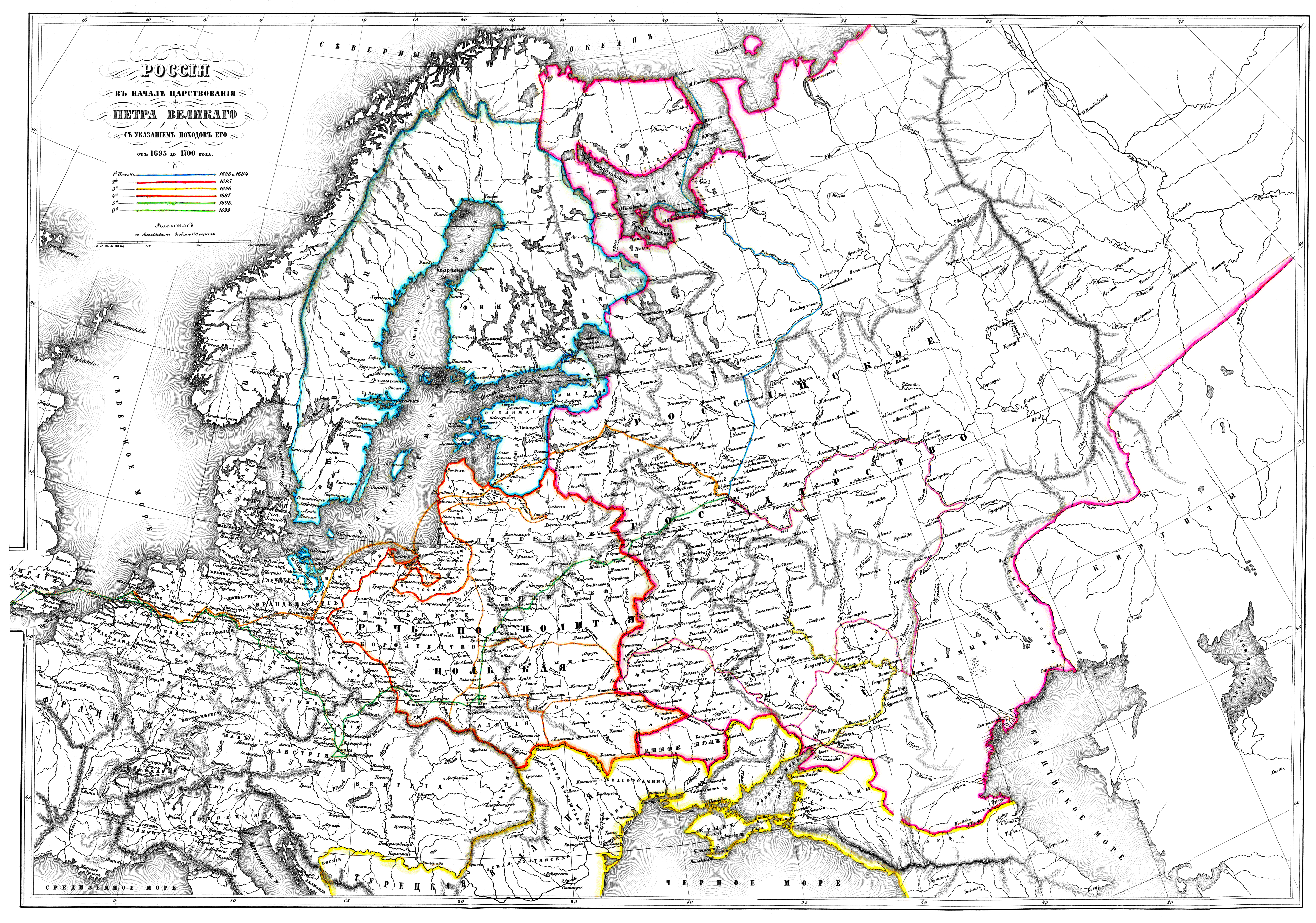 Россия в начале царствования Петра Великого с указанием походов его от 1693 до 1700 года.