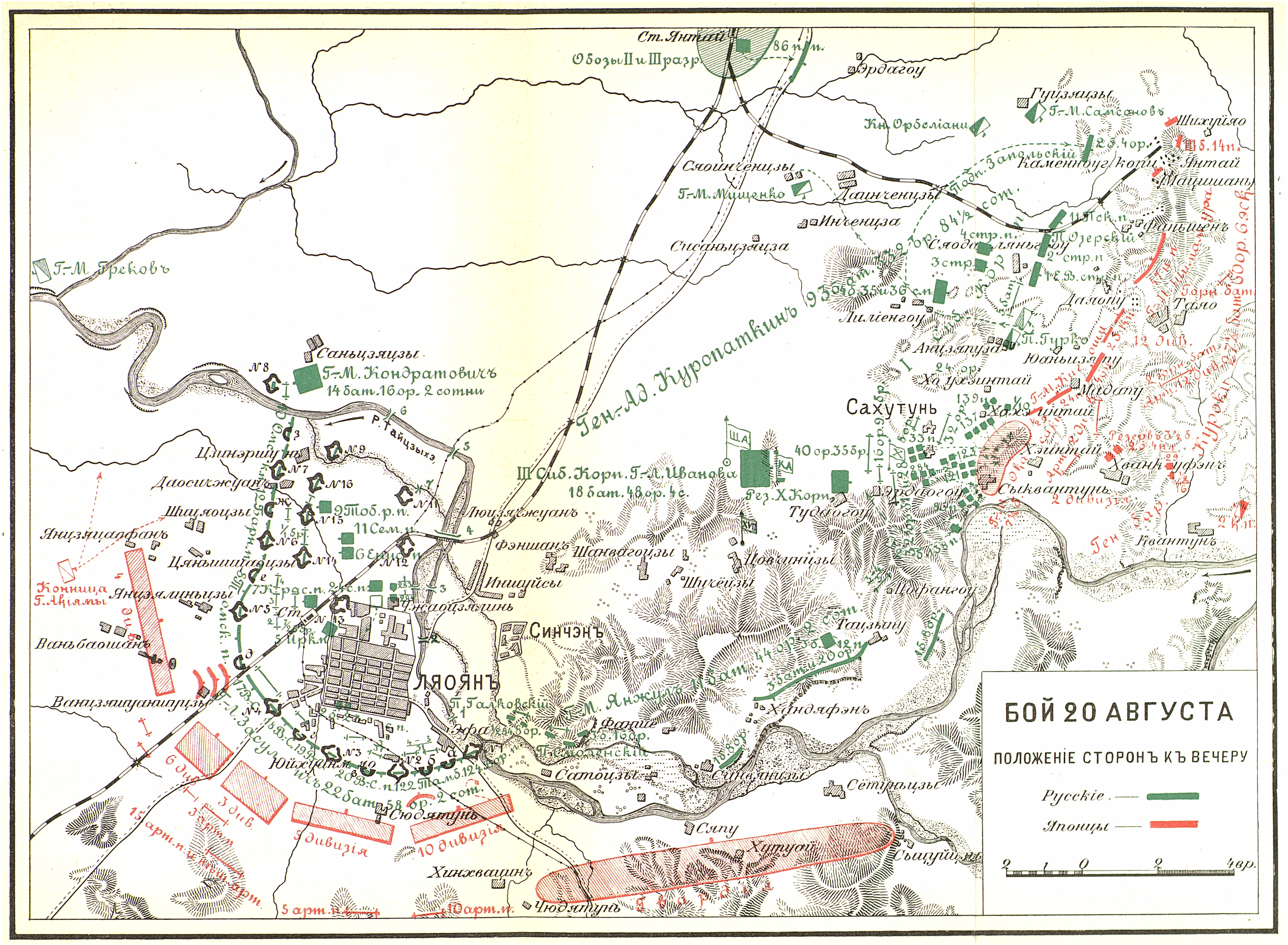 Бой под Ляояном 20 августа 1904 года. Положение сторон к вечеру