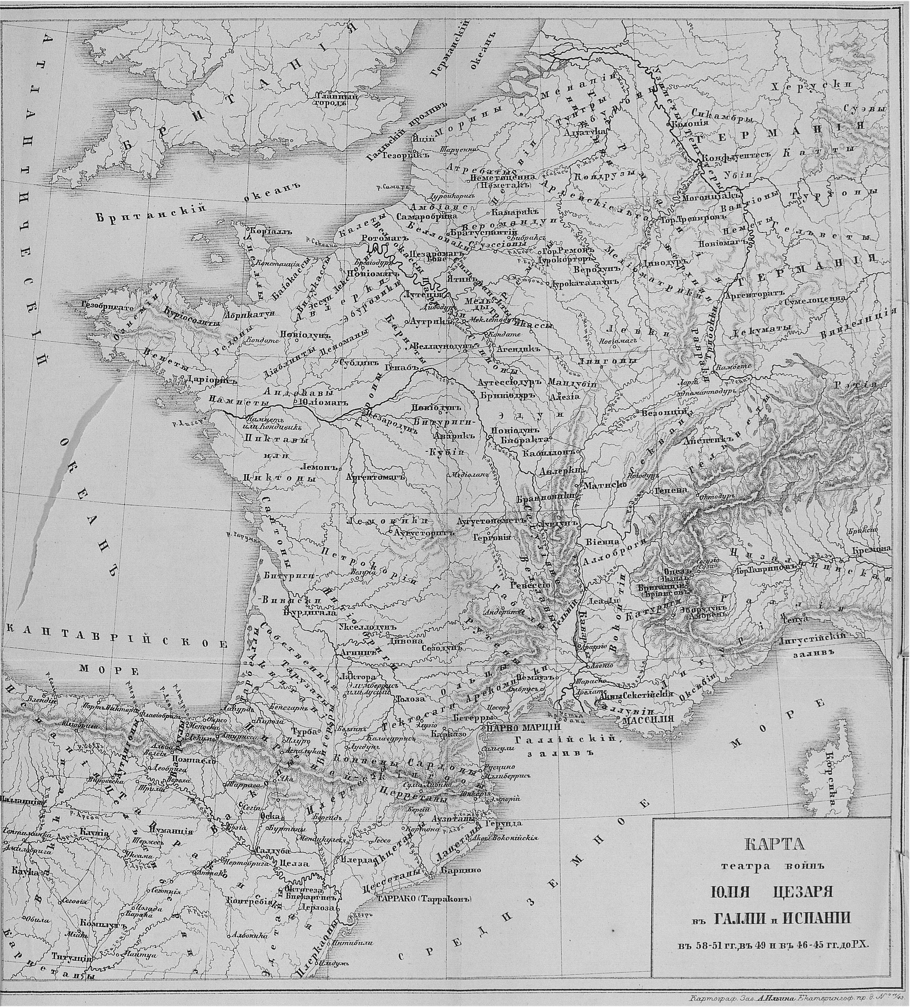 Театр войн Юлия Цезаря в Галлии и Испании в 58-51 годах, в 49 и в 46-45 годах до Р.Х.