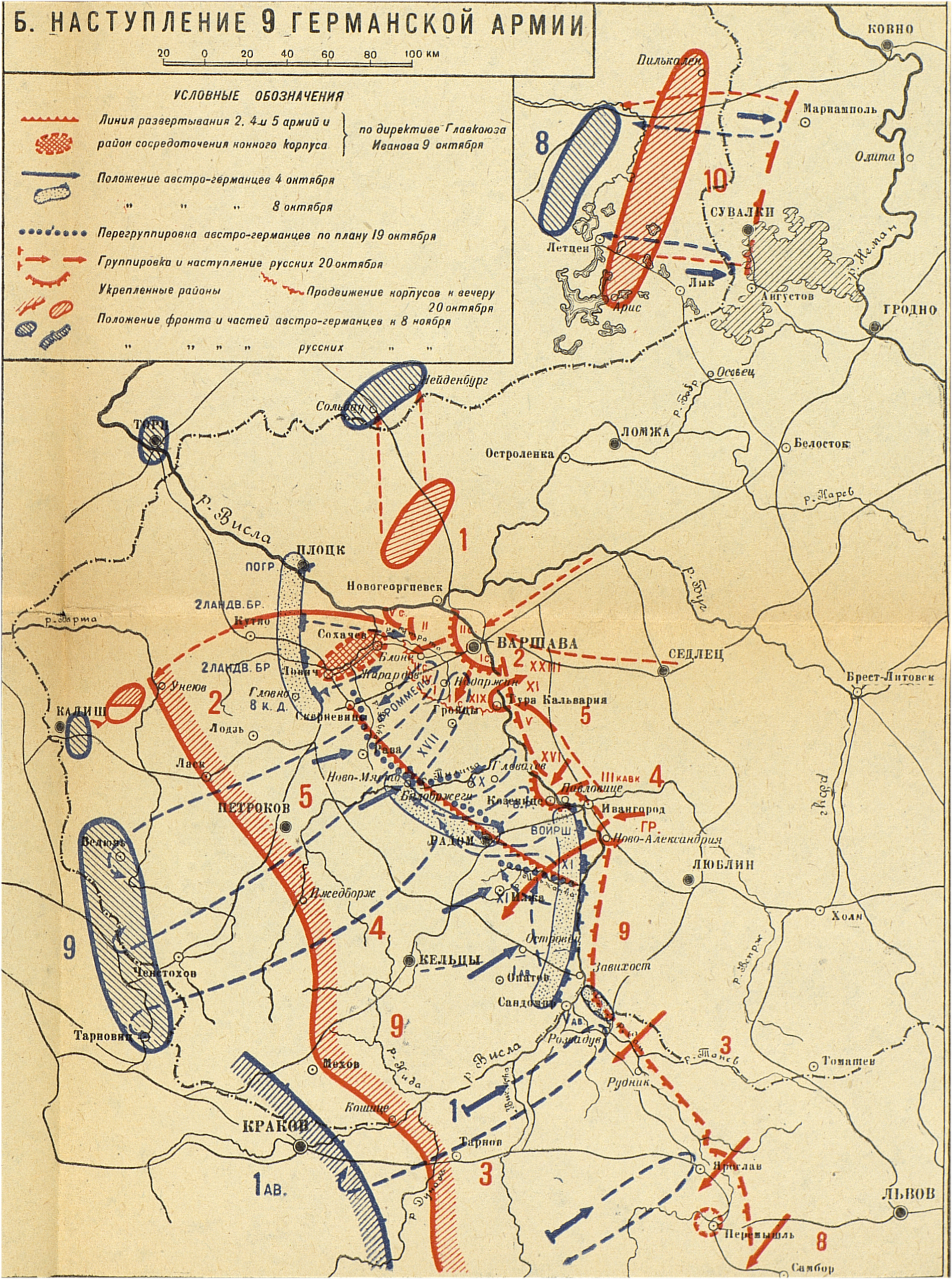 Кампания 1914 года. Русский театр. Операции на реках Висле и Сане. Наступление 9-й германской армии