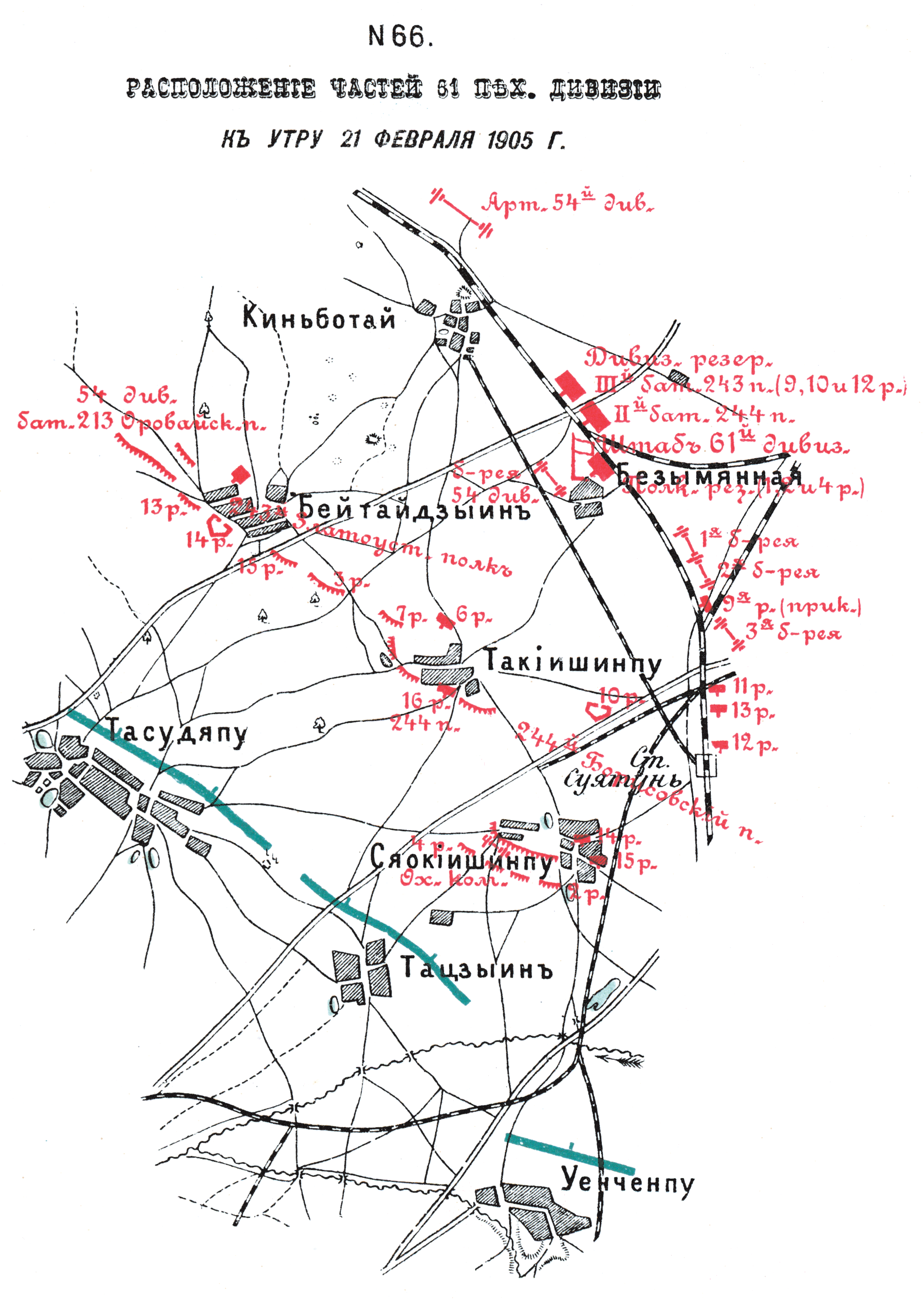 Расположение частей 61 пехотной дивизии к утру 21 февраля 1905 года