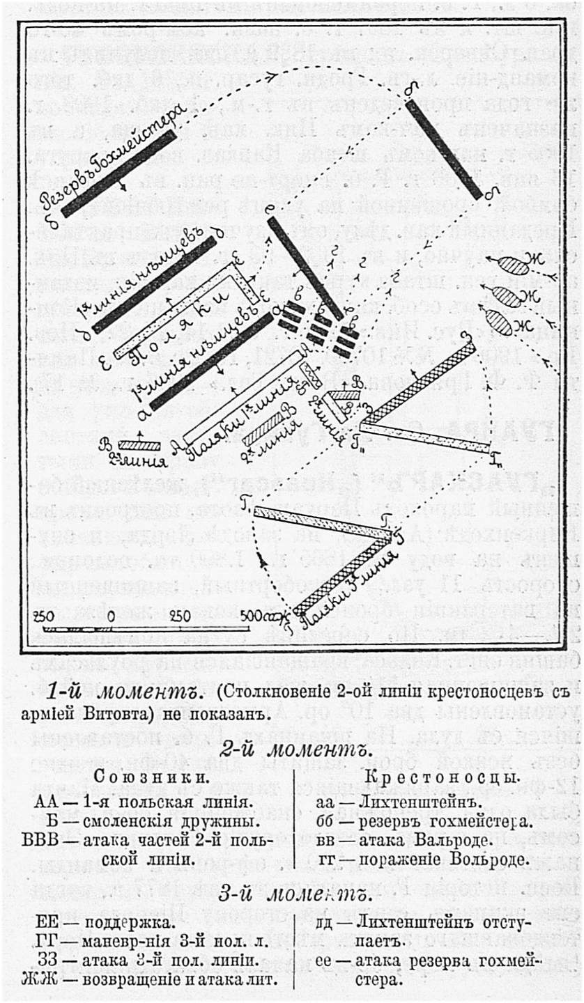 Отступившие было литовские войска, собранные и устроенные Витовтом, возвратились на поле сражения, и союзники окружили тевтонов, гохмейстер был убит, а 6 хоругвей 3-ей линии, предводимые фонТеттингеном, обратились в бегство. Сражение было проиграно орденом.