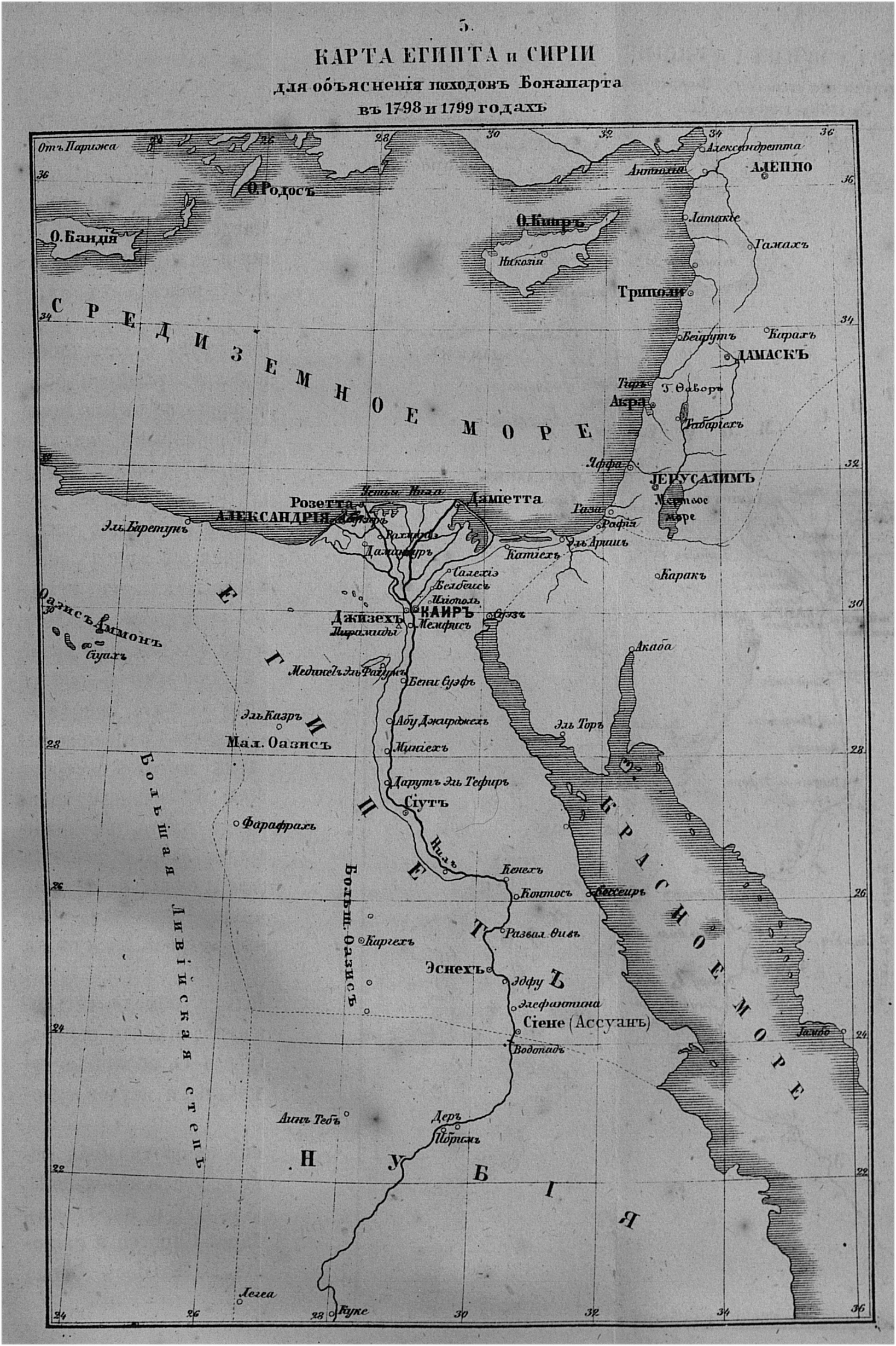 Карта Египта и Сирии для объяснения походов Бонапарта в 1798 и 1799 годах.