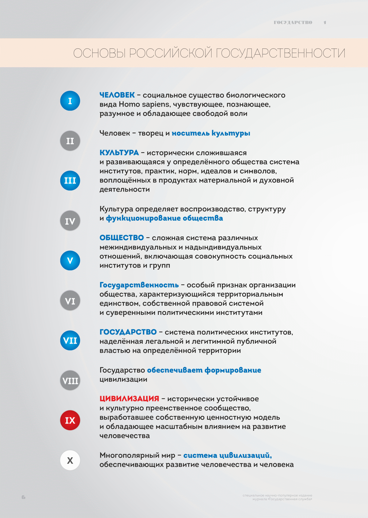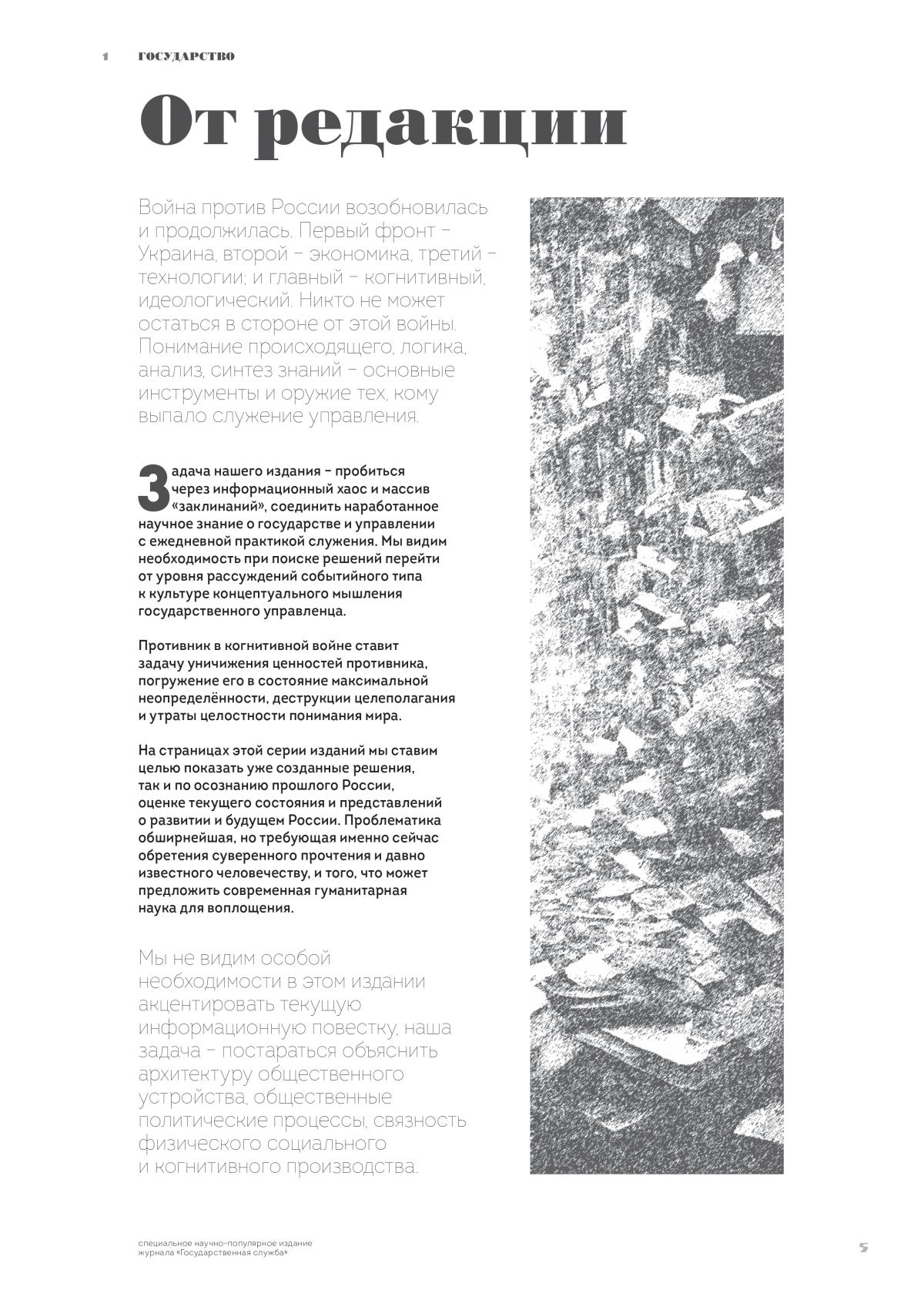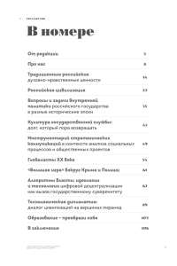 Издание представляет собой научно-популярный сборник статей, посвящённых различным аспектам деятельности и развития российского государства, его истории и способам управления. Основное внимание уделяется традиционным российским духовно-нравственным ценностям, их значению для национальной безопасности и противодействия внешним угрозам. Издание уделяет особое внимание зарождению и развитию российской цивилизации, концепциям её нынешнего существования и будущего. Отдельные статьи посвящены культуре государственной службы, её эволюции и современным вызовам, а также инструментам стратегических коммуникаций в контексте общественно-политических процессов. Значительное место занимают результаты исследований и рассуждения об образовании, культуре, экономике, праве, технологиях, цифровизации и их корреляции с государственным суверенитетом страны.