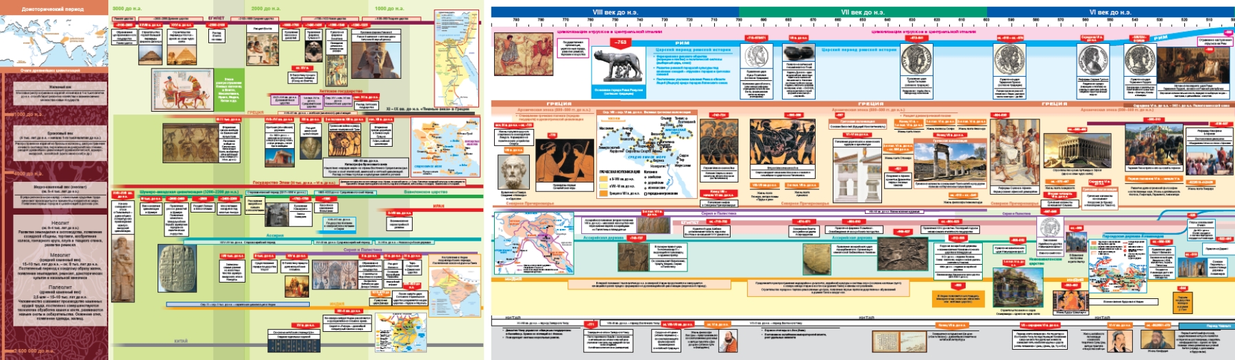 Настоящий выпуск посвящен истории Древнего мира до второй половины V в. н.э. (падение Западной Римской империи в 476 г.). Важнейшие политические и культурные события и процессы с аннотациями и иллюстрациями располагаются вдоль основной «ленты времени» на параллельных горизонтальных «лентах», которые обозначают ареалы цивилизаций Древнего мира: Грецию, Рим, Египет, Междуречье, Иран, Индию, Китай. Каждая из них открывается краткой хронологией периодов и событий до начала VIII в. до н.э. После этого периода идет основная «лента времени» в едином масштабе, что позволяет наглядно представить историю Древнего мира на протяжении тринадцати столетий.