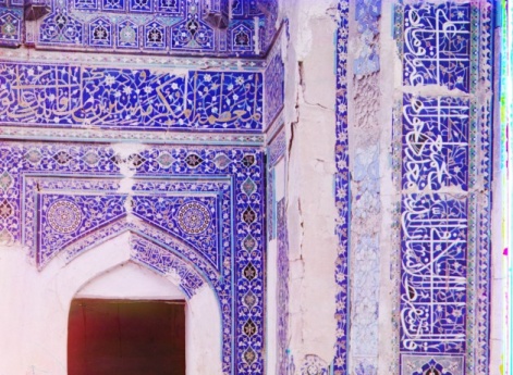 Самаркандская область. Самарканд. Образцы мозаичных стен в Шах-Зинде. Спарава внизу