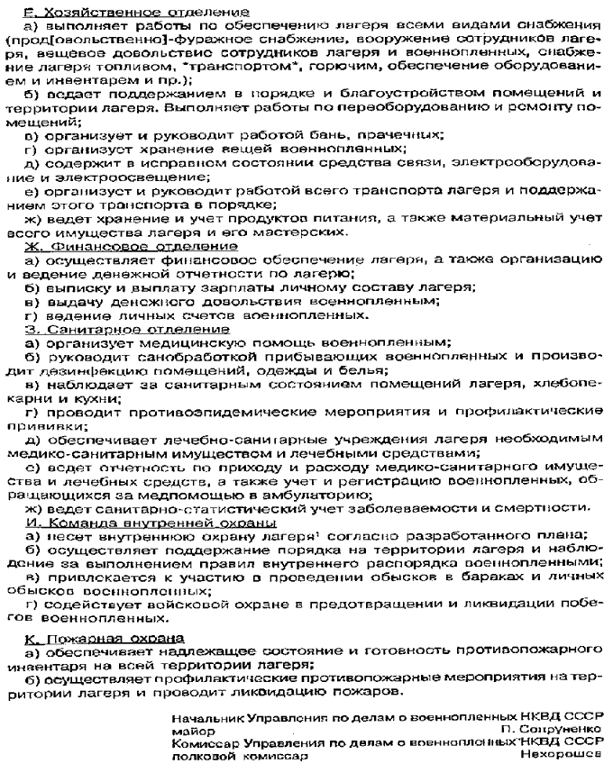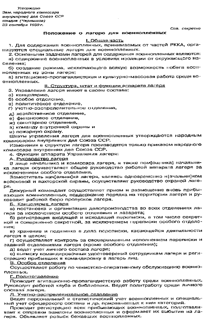 Положение о лагере для военнопленных Воспр. по: Военнопленные в СССР. 1939-1956: Документы и материалы / Науч.-исслед. ин-т проблем экон. истории ХХ века и др.; Под ред. М. М. Загорулько. — М.: Логос, 2000.