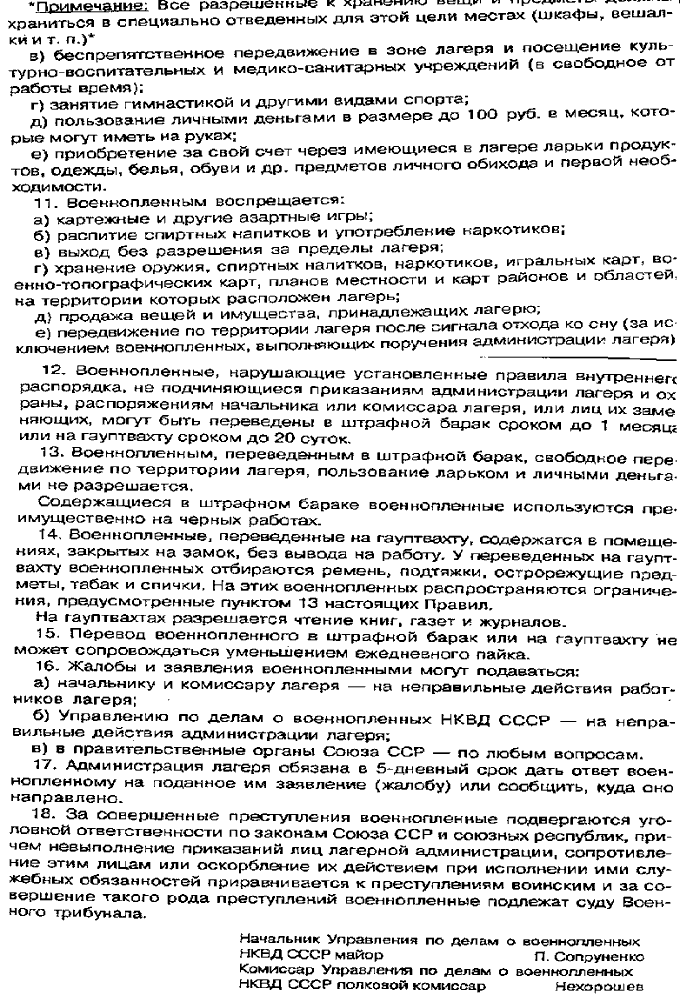«ПРАВИЛА ВНУТРЕННЕГО РАСПОРЯДКА ЛАГЕРЯ НКВД СССР ДЛЯ СОДЕРЖАНИЯ ВОЕННОПЛЕННЫХ» Воспр. по: Катынь. Пленники необъявленной войны. Документы и материалы. / Под редакцией Р. Г. Пихои, А. Хейштора.