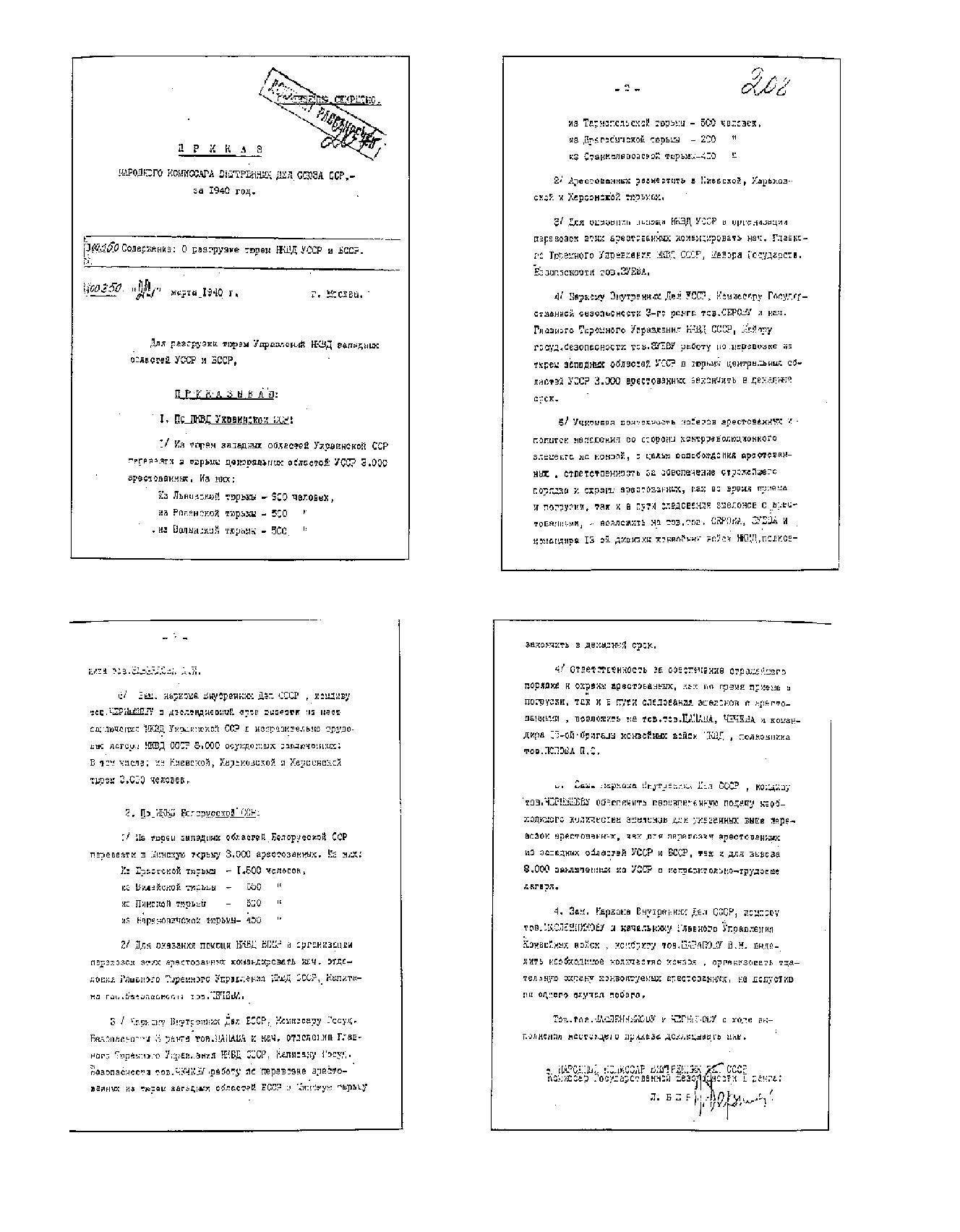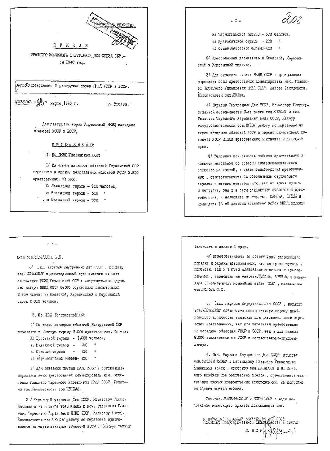 Приказ о разгрузке тюрем НКВД УССР и БССР. Воспр. по: Катынь. Пленники необъявленной войны. Документы и материалы. / Под редакцией Р. Г. Пихои, А. Хейштора.
