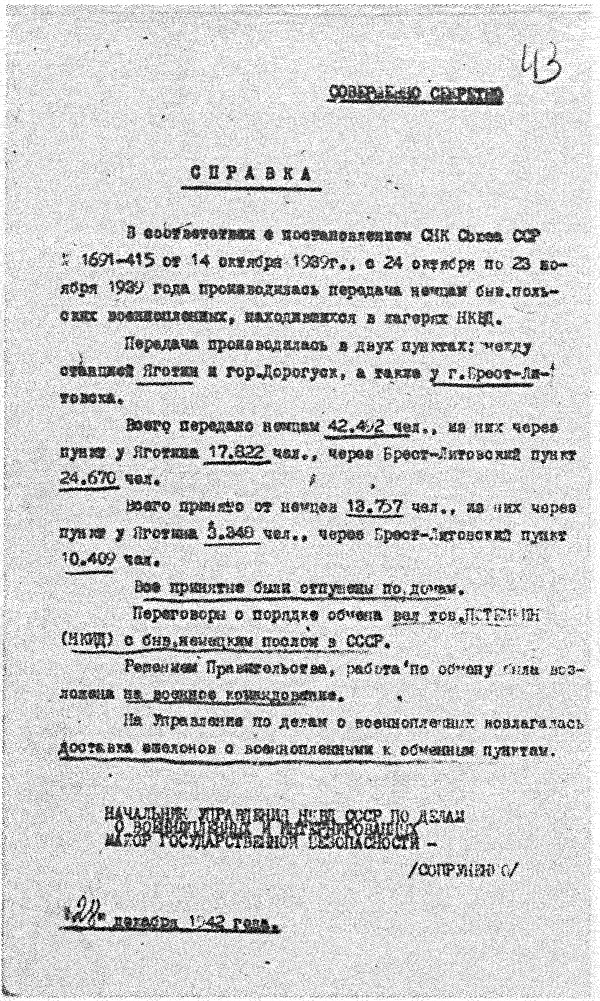 1942 год, 28 декабря Справка начальника УПВ НКВД СССР Сопруненко П. К. об обмене пленными с Германией в 1939 году.