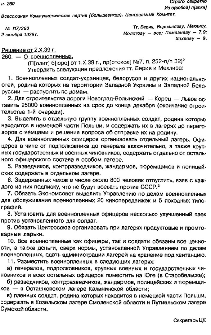 1939 год, 2 октября По предложению Берии все военнопленные были разделены на несколько категорий: часть отпущено, часть направлена на строительные работы, некоторые должны ожидать решения своей участи в лагере.