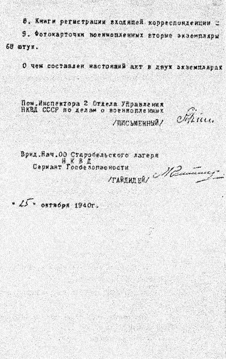 1940 год, 25 октября Акт уничтожения архивных дел выбывших военнопленных Старобельского лагеря путем сожжения.