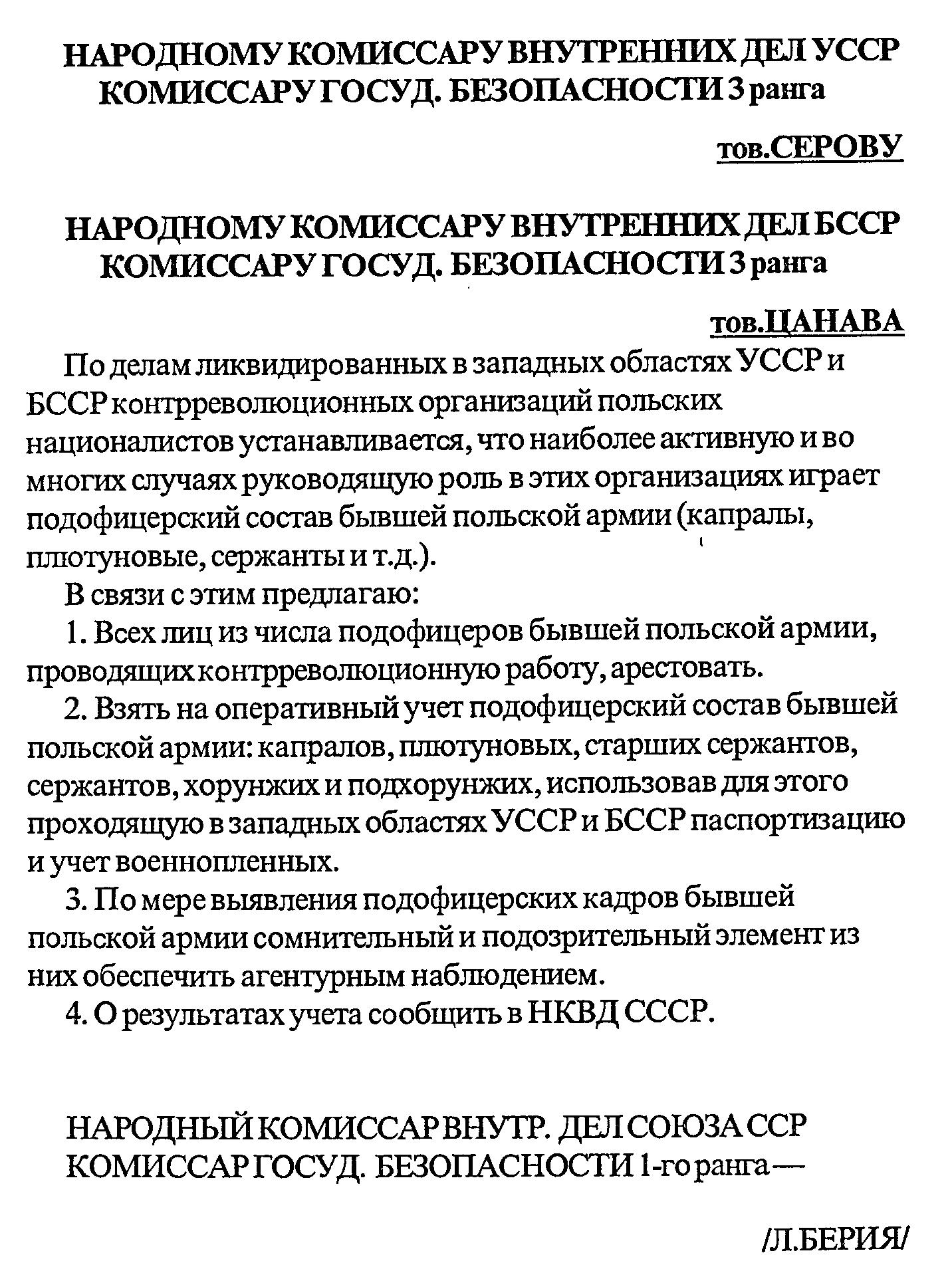 Распоряжение Л.П. Берии наркомам НКВД БССР и УССР о выявлении подофицерского состава