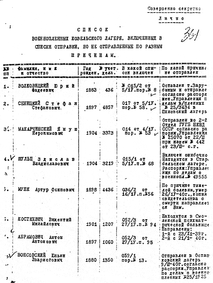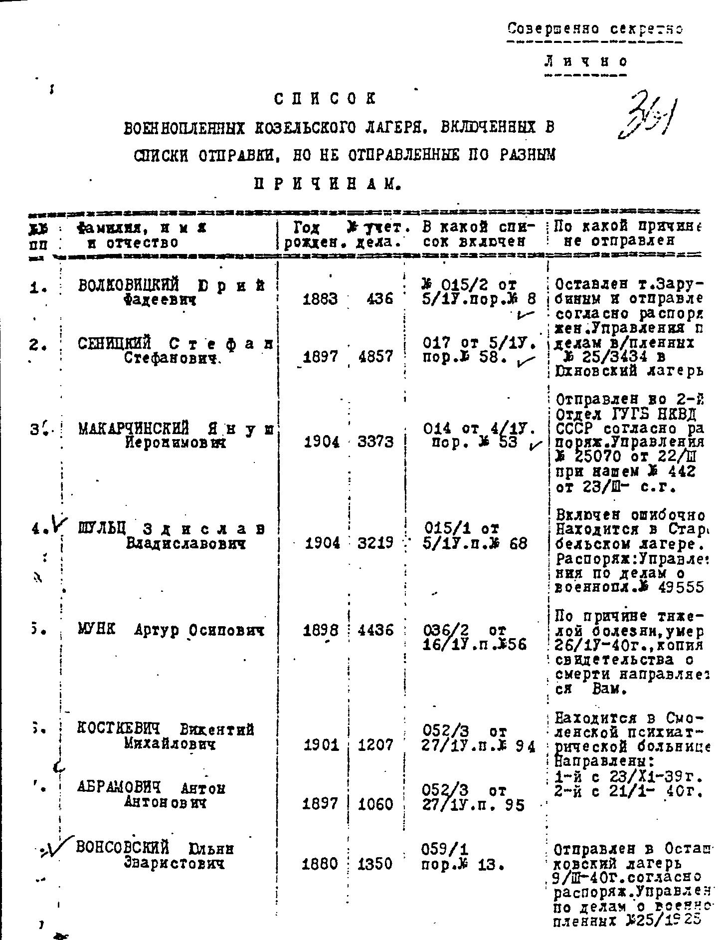 1940 год, 14 мая Списки военнопленных Козельского лагеря, включенные в списки отправки, но не отправленные по различным причинам.