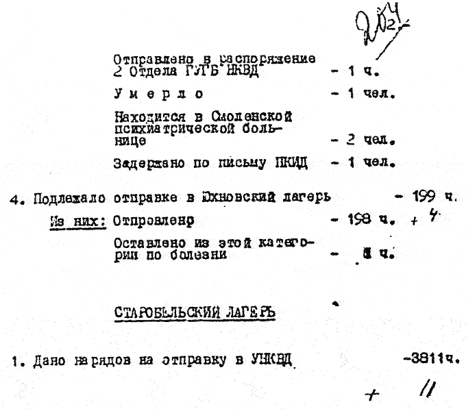 1940 год, не ранее 19 мая Справка об исполнении нарядов на отправку польских военнопленных их спецлагерей в распоряжение УНКВД соответствующих областей.