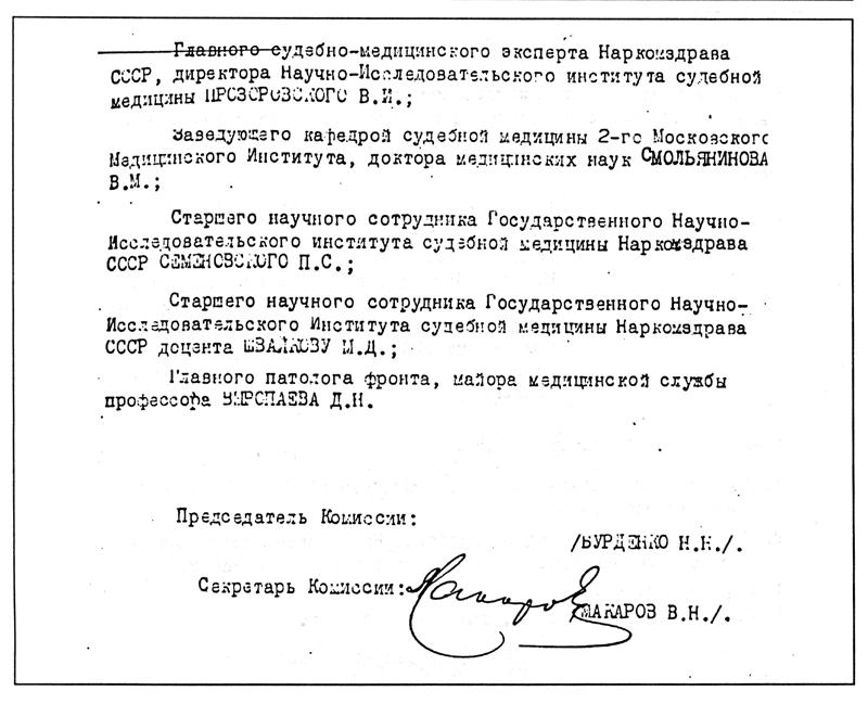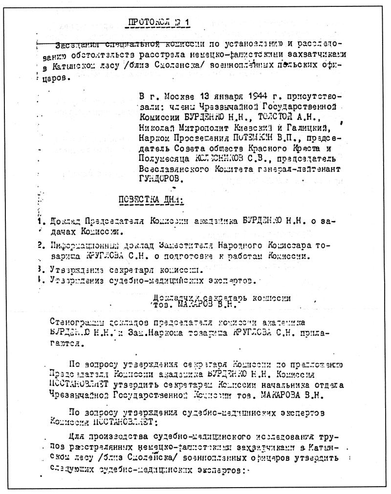 1944 год, 13 января Протокол заседания специальной комиссии по установлению и расследованию обстоятельств расстрелов немецко-фашистскими захватчиками в Катынском лесу военнопленных польских офицеров.