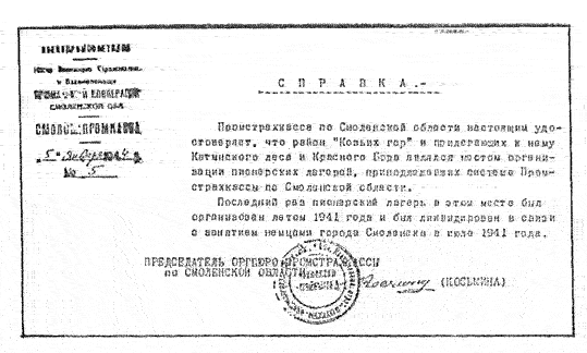 1941 год Справка председателя Промстрахкассы по Смоленской области, удостоверяющая, что район «Козьих гор» и прилегающего к ему Катынского леса являлся местом организации пионерских лагерей вплоть до лета 1941 года.