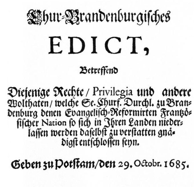 Прокламация, распространяемая в немецких землях, об издании в Бранденбурге-Пруссии Потсдамского эдикта объявлявшего о предоставлении убежища всем, кто претерпевает религиозные гонения у себя на родине.