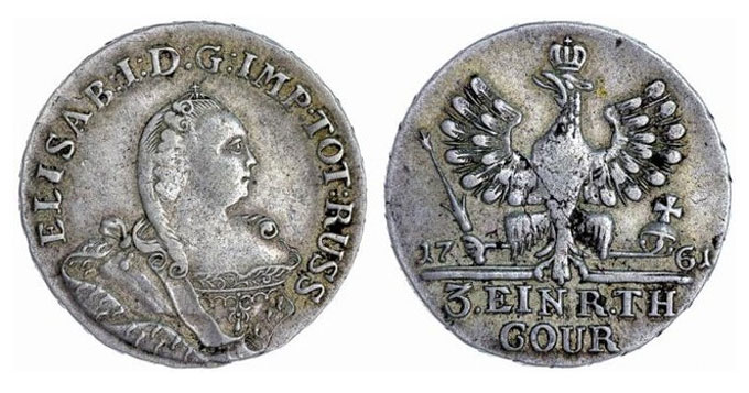 В 1761 году по приказу губернатора В. В. Суворова в Кёнигсберге начали чеканить монеты в 1/3 и 1/6 талера. На лицевой стороне находился портрет Елизаветы с круговой надписью по-латыни, а на обороте — прусский одноглавый орел, дата выпуска, указание номинала.