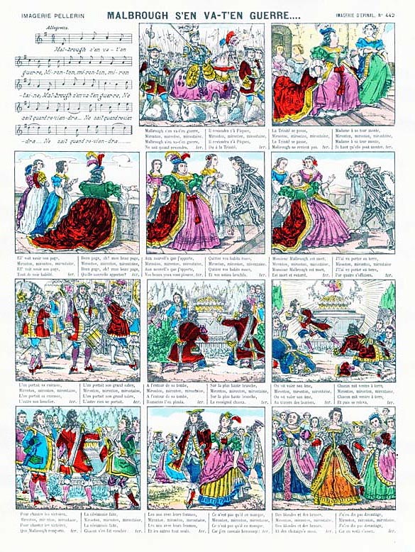 Французский листок середины XIX века с нотами, текстом и иллюстрациями к песенке «Мальбрук в поход собрался»