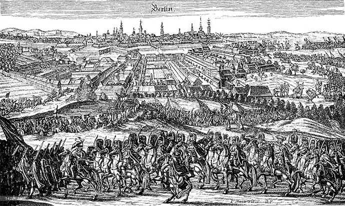 Взятие Берлина австрийскими императорскими войсками 16 октября 1757 года. Автор:Иоганн Мартин Вилл (нем. Johann Martin Will, 1727 – 1807). Гравюра на меди. XVIII век.