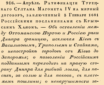 916. 1682 год. (3 января). Апрель. Ратификации Турецкого Султана Магомета IV на мирный договор, заключенный 1681 Российскими посланниками с Крымским Ханом. Об оставлении между Оттоманской Портою и Россией реки Днепра границей, исключая Киев с Василь...