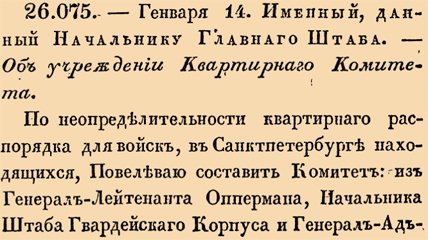 26075. 1816 год. 26 января (14 января ст.ст.) Именный, данный Начальнику Главнаго Штаба Об учреждении Квартирнаго Комитета. По неопределительности квартирнаго распорядка для войск, в Санктпетербурге находящихся, Повелеваю составить Комитет: из Генерал-Лейтенанта Оппермана, Начальника Штаба Гвардейскаго Корпуса, и Генерал-Адьютанта Голенищева-Кутузова, которому быть Председателем онаго. В Комитете сем сделать немедленно положение: сколько кому комнат давать по чинам, как в казармах, так и в нанимаемых от казны домах, кому именно давать казенныя квартиры, и как облегчить расходы по сей статье.
