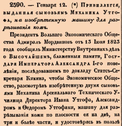 Президент Вольнаго Экономическаго Общества Адмирал Мордвинов от 13 Июля 1823 года сообщил Министерству Внутренних дел о Высочайшем, блаженныя памяти, Государя Императора Алекасандра I-го повелении, последовавшем по докладу Статс-Секретаря Кикина, чтобы Экономическое Общество, разсмотрев изобретенную двумя сыновьями Механика Арсенальнаго Техническаго Училища Директора Ивана Утгофа, Александром и Федором Утгофами, машину для разрезывания кожи по плоскости ея на две, на три и более части, и удостоверяясь в пользе оной, отнеслось к Министру Внутренних дел <…>