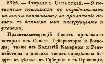3726. 1721 год. 12 февраля (1 февраля ст.ст.) Сенатский. О печатных пошлинах с определенных на мечта чиновников; за приложение печати к данным им инструкциям и указам.Правительствующий Сенат приказали: которые из Сената Губернаторы и Воеводы, также из Коллегий Камериры и Рентмейстеры и прочих чинов определены будут к делам в Губернии и в Провинции, и даны им будут инструкции или указы: и с таких инструкций или указов в Печатном приказе брать пошлины с таких, которым определено будет давать жалованье только с одной Провинции. И которым определенным таких чинам инструкции или указы в Печатном приказе упечати были, а надлежащих с них пошлин не взято: и о тех пошлинах, что взять доведется, выписав, отослать ведомость в Штатс-Кантор-Коллегию, а в той Коллегии те пошлины велеть вычесть у дачи жалованья