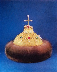 Шапка Мономаха. Конец XIII - начало XIV в.«4 февраля 1498 года в Успенском соборе, среди церкви, приготовили место большое там, где святителей ставят; на этом месте поставили три стула: великому князю, внуку его, Димитрию, и митрополиту; на налое лежала шапка Мономахова и бармы. Когда великий князь с внуком вошли в церковь, митрополит со всем собором начал служить молебен богородице и Петру-чудотворцу, после чего митрополит и великий князь сели на своих местах, а князь Димитрий стал у мест пе...