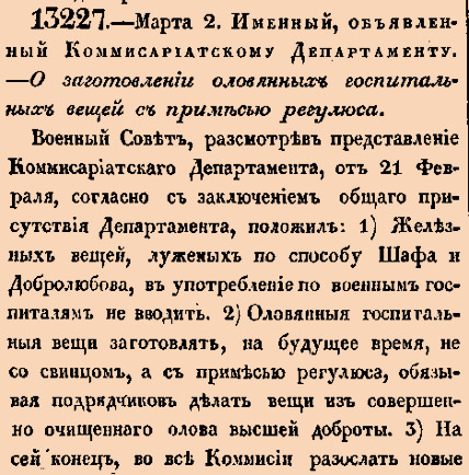 13227. 1840 год. 14 марта (2 марта ст.ст.) Именный, объявленный Коммисариатскому Департаменту. О заготовлении оловянных госпитальных вещей с примесью регулюса.<…> 1) Железных вещей, луженых по способу Шафа и Добролюбова, в употребление по военным госпиталям не вводить. 2) Оловянныя госпитальныя вещи заготовлять, на будущее время, не со свинцом, а с примесью регулюса, обязывая подрядчиков делать вещи из совершенно очищеннаго олова высшей доброты <…>