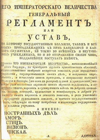 «Каждая коллегия получила регламент с перечислением прав и обязанностей применительно к находившейся в ее ведении отрасли управления. Регламенты Бергколлегии и Мануфактурколлегии, кроме того, устанавливали привилегии промышленникам, чем способствовали развитию крупного производства. Особое место среди регламентов занимал Генеральный регламент. Он определял права и обязанности должностных лиц всех центральных учреждений, начиная от президента коллегии и кончая истопником и служителем, который сидел в прихожей, и когда «в колокольчик позвонят», то должен был «войтить и принять повеление».