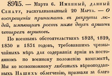 8945. 1836 год. 6 марта (18 марта). Именный, данный Сенату, распубликованный 20 марта. О воспрещении принимать в рекруты людей, имеющих рост ниже двух аршин четырех вершков.