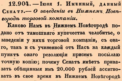 12904. 1767 год. 12 июня (1 июня ст.ст.) Именный, данный Сенату. О заведении в Нижнем Новгороде торговой компании.Каково Нам в Нижнем Новгороде подано от тамошняго купечества челобитье, о заведении у них торговой компании, с онаго, так и с учиненной от Нас на каждый пункт онаго резолюции присеем посылаю точную копию; почему Сенат имеет приказать обещанныя им 20000 рублей ассигновать в свое время в Нижнем Новгороде из тамошней соляной суммы на счет Коммерческаго Банка, а подлинное их челобитье с Нашей резолюциею отослано для исполнения к Нижегородскому Губернатору Аршеневскому <…>