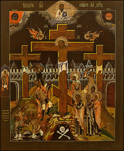 Распятие с предстоящими. Икона первой половины XIX века. Россия.