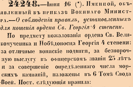 24248. 1850 год. 16 июня (28 июня). Именной, объявленный в приказе Военнаго Министра. О соблюдении правил, установленных для ношения ордена Св.Георгия 4 степени.