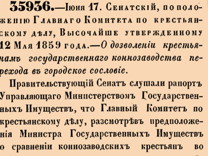35936. 1860 год. 29 июня (17 июня ст.ст.). Сенатский, по положению Главнаго Комитета по крестьянскому делу, Высочайше утвержденному 12 Мая 1859 года. О дозволении крестьянам государственнаго коннозаводства перехода в городское сословие.<…> Приказали: О таковом донесении Управляющаго Министерством Государственных Имуществ дать знать всем Казенным Палатам, а для приведения в исполнение по ведомству государственнаго коннозаводства предоставить Управляющему Министерством Государственных Имуществ сделать зависящее с его стороны распоряжение, и о сем уведомить Главноуправляющаго Государственным Коннозаводством. О чем послать указы