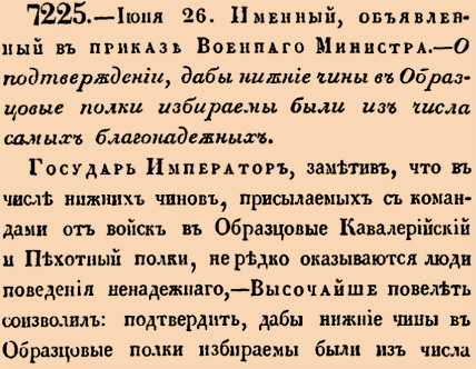 7225. 1834 год. 26 июня (8 июля). Именный, объявленный в приказе Военнаго Министра. О подтверждении, дабы нижние чины в Образцовые полки избираемы были из числа самых благонадежных.
