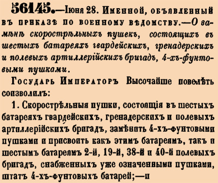 56145. 1876 год. 28 июня (10 июля). Именной, объявленный в приказе по военному ведомству. О замене скорострельных пушек, состоящих в шестых батареях гвардейских, гренадерских и полевых артиллерийских бригад, 4-х фунтовыми пушками.