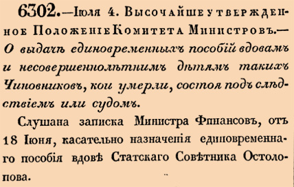 6302. 1833 год. 16 июля (4 июля ст.ст.) Высочайше утвержденное Положение Комитета Министров. О выдаче единовременных пособий вдовам и несовершеннолетним детям таких Чиновников, кои умерли, состоя под следствием или судом.Слушана записка Министра Финансов, от 18 Июня, касательно назначения единовременнаго пособия вдове Статскаго Советника Остолопова <…>