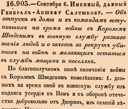 16903. 1790 год. 17 сентября (6 сентября ст.ст.). Именный, данный Генерал-Аншеф Салтыкову. Об отпуске в домы и командам вступивших на время войны с Королем Шведским в военную службу разнаго звания людей и о зачете за рекрут убитых на войне и желающих остаться в службе мещан и поселян По благополучном ныне окончании войны с Королем Шведским повелеваем: 1. Данных на время оной в военную службу из подвига усердия к Нам и к обороне отечества добровольно от Дворян, из селений ведомства Царскосельскаго, також из мещан и поселян ведомства Директора Экономии разнаго звания людей отпустить немедленно в домы их <…>