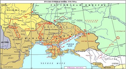 «Белградский мирный договор 1739 года положил конец русско-турецкой войне 1735-1739 гг. Одновременно заключен был и мир с Турцией Австрии, воевавшей на стороне России в силу союзного договора с ней. С самого начала Австрия склоняла Россию к заключению мира на условиях отказа от территориальных приобретений России в Северном Причерноморье. Переговоры о мире проходили при посредничестве французского представителя маркиза де Вильнева, избравшего тактику затягивания переговоров с целью еще большего ослабления Австрии. Однако, опасаясь закрепления успеха русских войск, взявших в августе 1739 года. Хотин и Яссы, он был вынужден ускорить заключение мира, чтобы не допустить усиления России. В условиях, когда 1 сентября 1739 года австрийское правительство вынуждено было подписать сепаратный мир с Турцией, не дожидаясь согласия на это России, война для нашей страны стала бесперспективной. Это обусловило умеренный характер требований России перед Турцией. По условиям мира, Россия получала Азов (при условии срытия его укреплений); право построить крепость на донском острове Черкасе (а Турция - в устье Кубани); Большая и Малая Кабарда были объявлены нейтральным барьером между двумя странами-соперниками; Россия соглашалась с запретом ей держать корабли на Азовском и Черном морях. Торговля с Турцией должна была вестись только на турецких кораблях. Русским паломникам были даны гарантии свободного посещения святых мест в Иерусалиме.