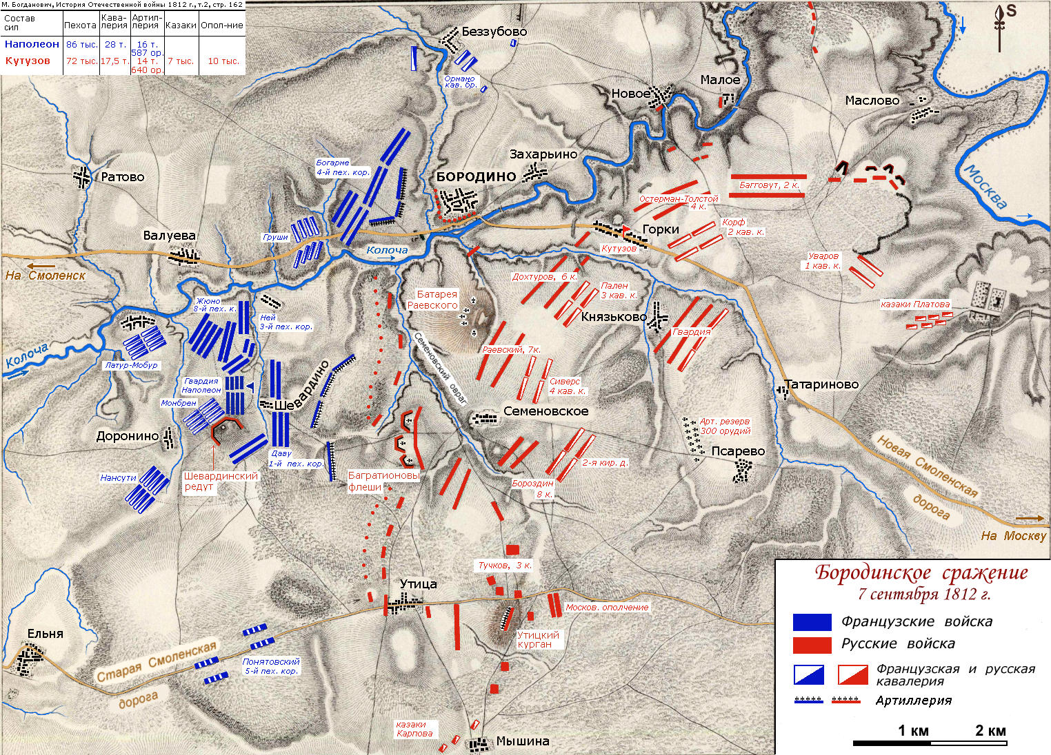 Наступал вечер. Величайшая битва всей наполеоновской эпопеи шла к концу, но как назвать этот конец? Это не было ясно ни Наполеону, ни маршалам. Они на своем веку видели столько настоящих, блистательных побед, как никто до них не видел, но как назвать победой то, что произошло только что в этот кровавый день 7 сентября? Бюллетень можно было написать какой угодно. Вот что писал, например, Наполеон императрице Марии-Луизе, своей жене, на другой день после битвы: «Мой добрый друг, я пишу тебе на поле Бородинской битвы, я вчера разбил русских. Вся их армия в 120 тысяч человек была тут. Сражение было жаркое; в два часа пополудни победа была наша. Я взял у них несколько тысяч пленных и 60 пушек. Их потеря может быть исчислена в 30 тысяч человек. У меня было много убитых и раненых».