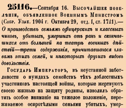 25116. 1904 год. 16 сентября (29 сентября). Высочайшее повеление, объявленное Военным Министром. О производстве семьям офицерских и классных чинов, убитых, умерших от ран и скончавшихся от болезней на театре военных действий – трети содержания, прич...