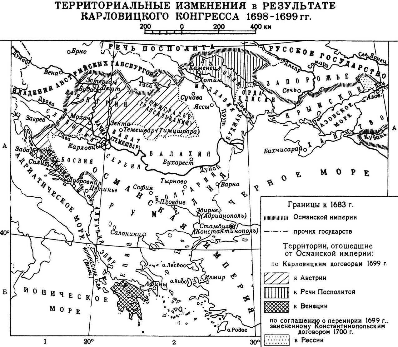 26 января 1699 между Австрией, Польшей, Венецианской республикой и Османской империей был заключен Карловицкий мир. По условиям мирного договора к Австрии отходили вся Венгрия, а также Трансильвания и Тимишоара. Венеция закрепила за собой полуостров Морея и Далмацию. Польша возвратила потерянные по условиям Бучачского мира земли, в том числе Подолье и другие части Правобережной Украины.
